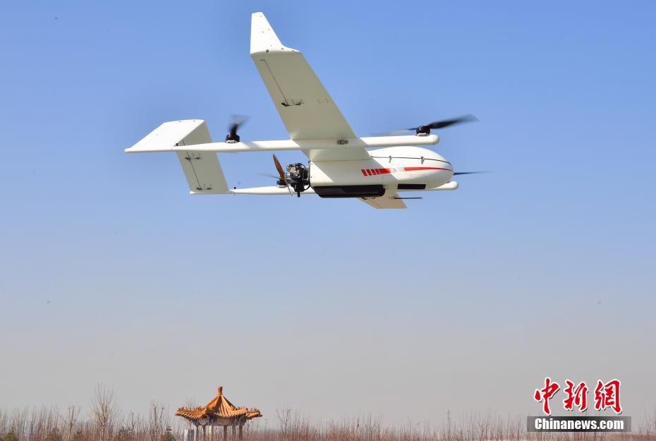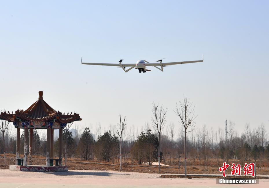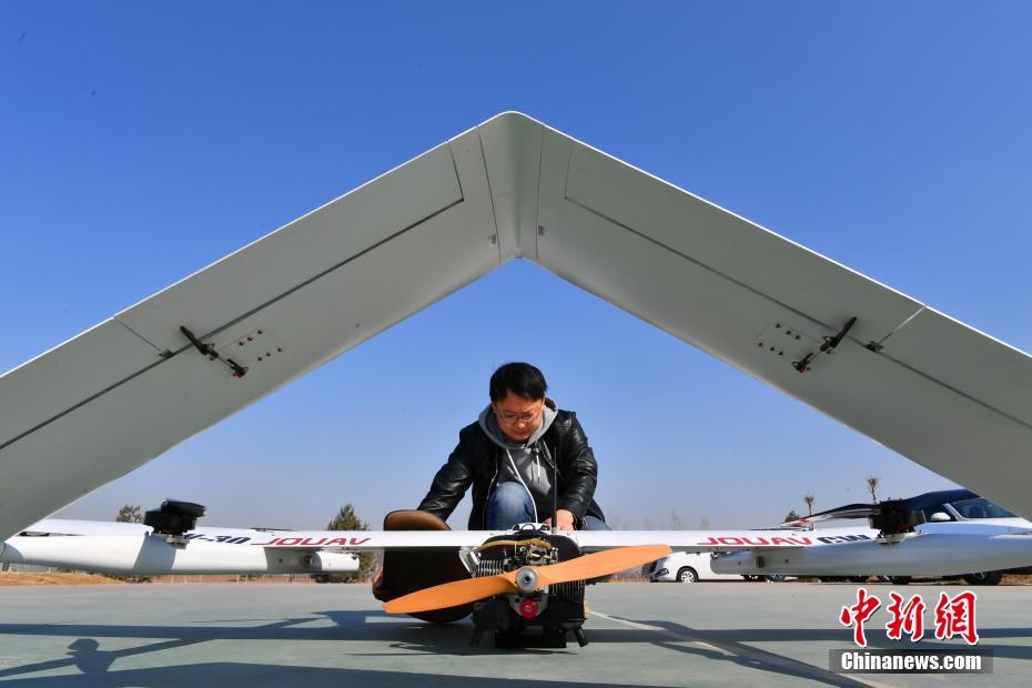 3月7日,河北石家庄长安区,城市管理综合行政执法局工作人员正在给无人机“城管”做起飞前的检测。据了解,该超大无人机翼展约4米。2019年初,长安区城市管理综合行政执法局在全市率先启用无人机全域航拍技术,对全区138平方公里市容市貌进行航拍,通过高空“千里眼”消除城市管理死角。这一技术现阶段主要应用于露天垃圾和私搭乱建的整治。