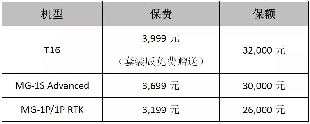 2019 年,「关怀计划」升级。用户购买T16 植保无人飞机高配版套装赠送价值3,999元的关怀计划,在一年有效保障期限内,免费享有32,000 元的保险额度;购买MG-1P系列植保机关怀计划,价格下调 800 元,由原来的3,999 元调整为3,199元;如用户需要对MG 系列植保机进行续保,根据上年出险次数,进行阶梯定价,出险次数越少越省钱,最高可享受 5 折优惠,具体续保方案将于3月下旬上线,敬请期待。