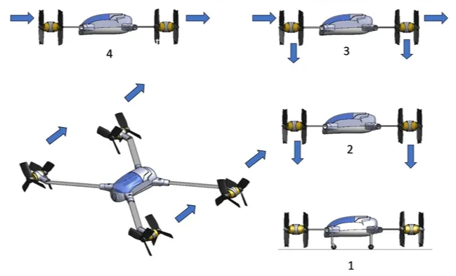 推力矢量功能利用柔性凸轮控制螺旋桨以引导气流。这允许四轴飞行器在不倾斜转子系统或机身的情况下起飞和着陆并向前飞行。前向转子可以利用可变节距和增加机翼来更有效地产生更高的速度。