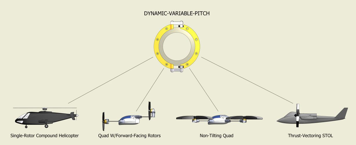 动态可变螺距基于由柔性钢制成的柔性凸轮和与螺旋桨或转子系统配合的其他独特部件。凸轮矢量推力和对抗升力不对称。推力矢量的好处是能够在没有跑道的情况下起飞和降落。Blainjett Aviation的技术可以做到这一点,同时避免了其他系统的一些缺点。该凸轮还可以抵抗升力的不对称,使直升机在向前飞行中稳定,增加速度从不超过(VNE)速度。