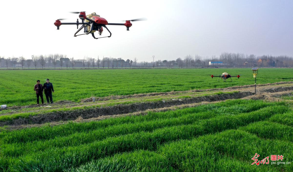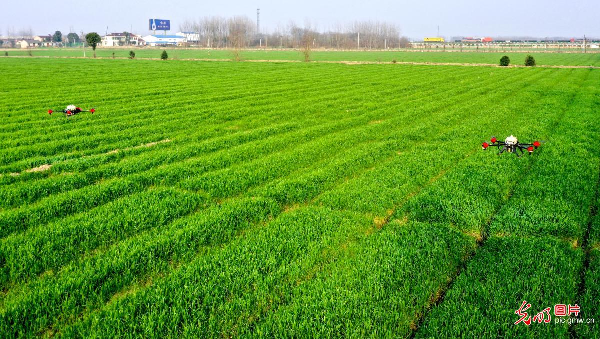 2019年3月9日,两台植保无人机在麦田里进行除虫作业。