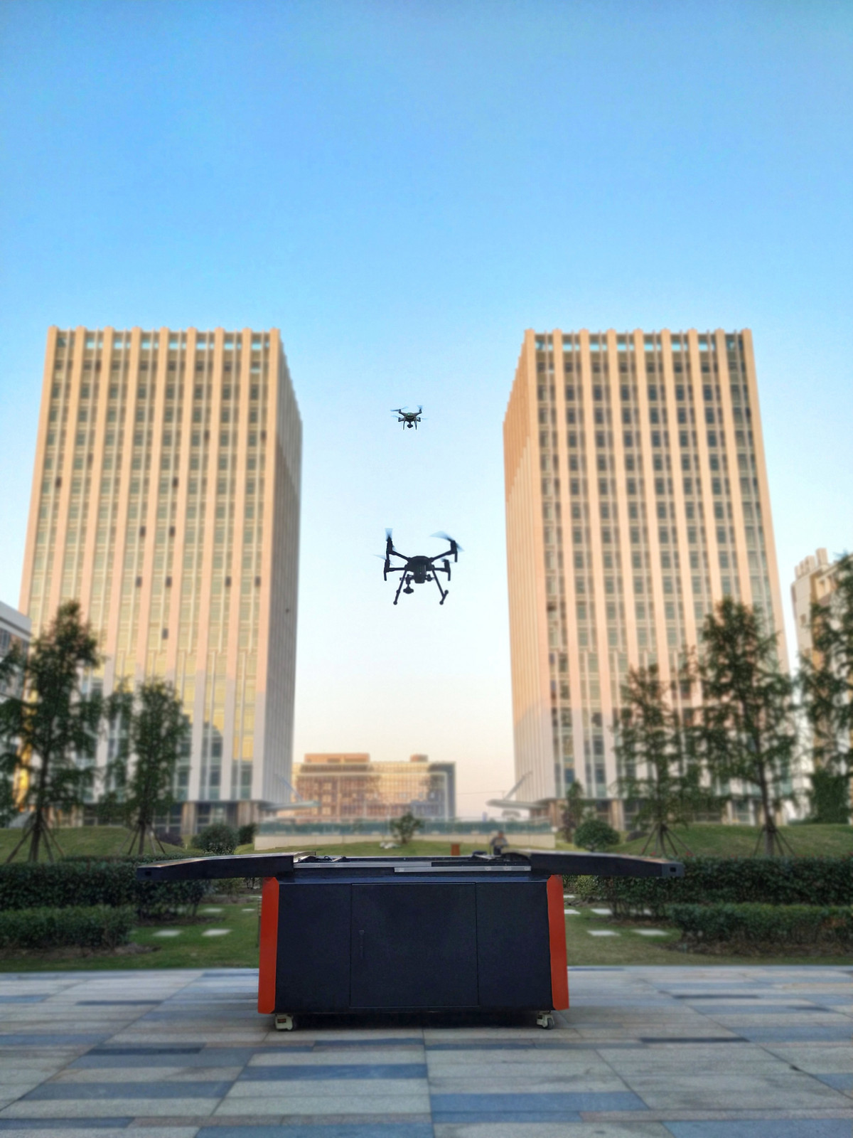 这套系统的特点在于,加入了普适性无人机自动驾驶软件:调度智能软件根据 BIM / GIS / UTM 信息为无人机规划路线并导航;遵照空中的红绿灯规则有序起降,接续飞行,并自动化管理电池数据;利用制导智能软件以及机器视觉与辅助系统,无人机可实现自主回库,且复杂环境下仍可使用。