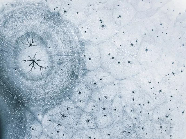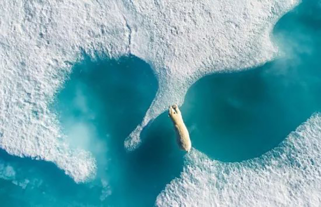 弗洛里因一幅正在跨越浮冰的北极熊的画面而荣获年度最佳摄影奖。整个画面由蓝白两色构成,其中一片冰蓝色的大海幽深神秘,宛若巨大的蓝色琥珀,其上被两块分离的巨大冰块所覆盖,为其增添了一份圣洁,尽显雪国绮丽风光。而在两块冰断裂的缺口之间,一只通体雪白的北极熊正伸展身躯,前后四肢分别扒住两块冰,奋力向前跨越海面,为宁静冷寂的雪原注入了一股蓬勃生气,使得整个画面都生动起来。大海浮冰的柔美壮阔与憨厚白熊的狂野活力交相辉映,一静一动,两种原本对立的美此刻犹如水乳完美融合,给人以丰富又和谐的感受。