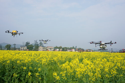 3月11日,在重庆市大足区铁山镇胜丰村,数台农用植保无人机腾空而起,向当地种粮大户展示了无人机高效喷洒农药的强大功能。这让在现场围观的几位中年农民惊叹起来,大家赞叹说“无人飞机真厉害,喷洒农药动作快。看来现在不会飞无人机,还真当不了现代农民。”