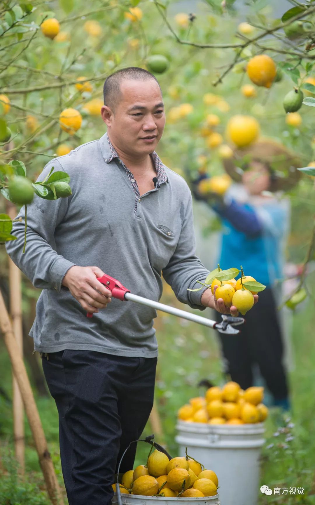 △为了赶订单,郭建华父子俩前来果园帮忙摘柠檬。