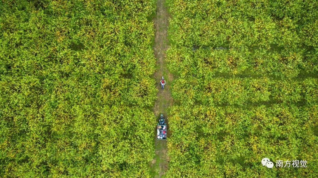 △郭建华和父亲骑着三轮摩托载着无人机经过大片柠檬园区。