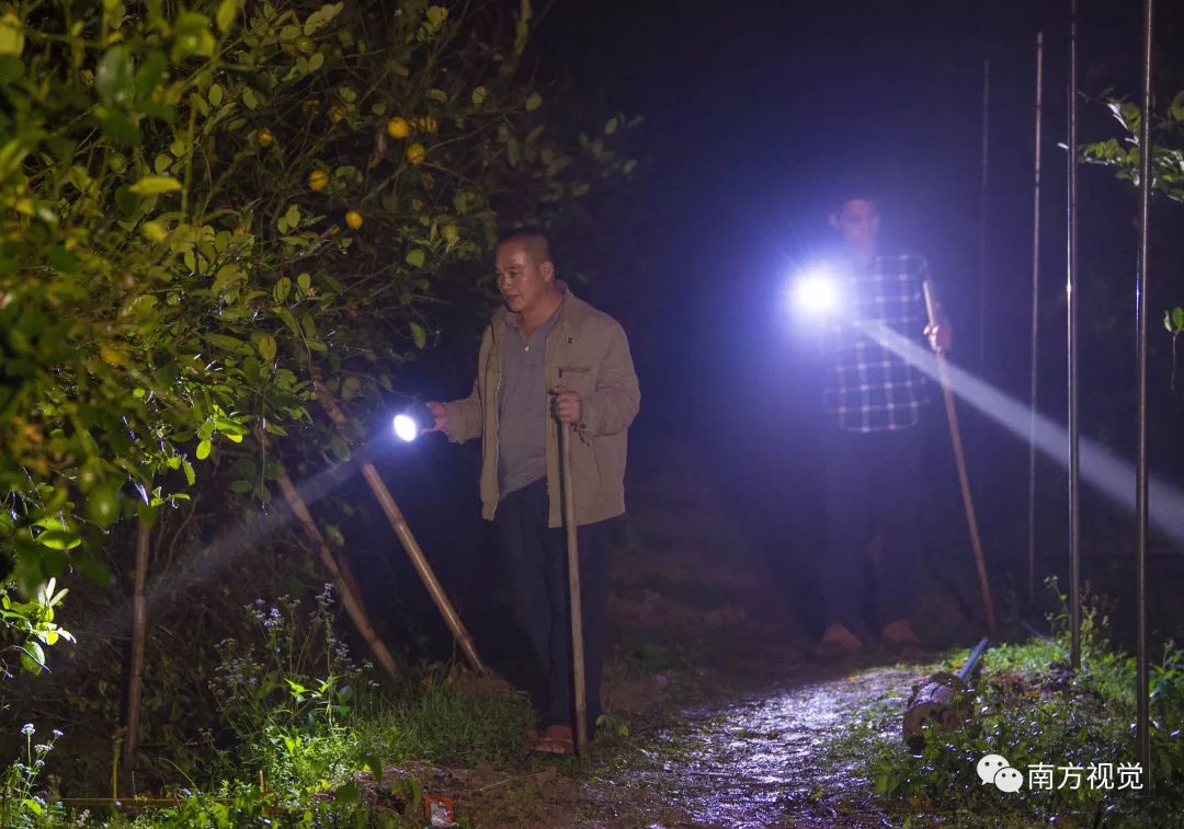 △晚上,郭建华和父亲在果园巡逻。