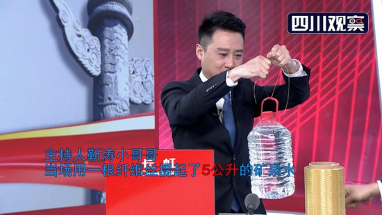 听起来很炫彩、很夺目,为了让电视机前的观众朋友有更直观的感受,主持人现场做了个试验——用这根纤维丝悬挂一瓶5L的矿泉水,结果会不会让人失望呢?点击视频查看呀!