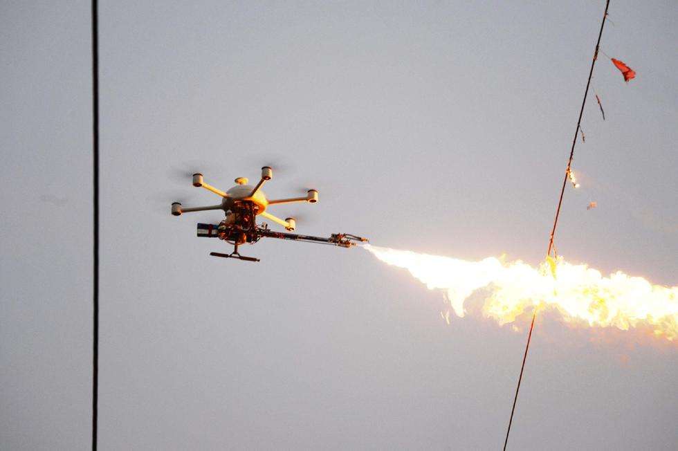 3月15日,国网达州供电公司输电运检工作人员在巡线中观测到220千伏州化二线N15号塔B相小号侧15米处有塑料彩条布缠绕在导线上,由于该线路是500千伏达州变电站向220千伏化工园变电站供电的骨干网络,担负着达钢二甲醚,玖园化工,齐鲁石化,翁福化工等重要客户供电任务。该公司运维部门立即着手隐患排除工作,由于缠绕物距离铁塔位置较远,带电作业相对困难;常规消缺作业停电难度大又耗时较长,在优化隐患整治方案后,最终决定选择利用无人机喷火装置消除异物缠绕隐患。这是国网达州供电公司首次利用无人机排除线路隐患,也是该公司在今年首次运用无人机巡检变电站后又开创的一个先例。
