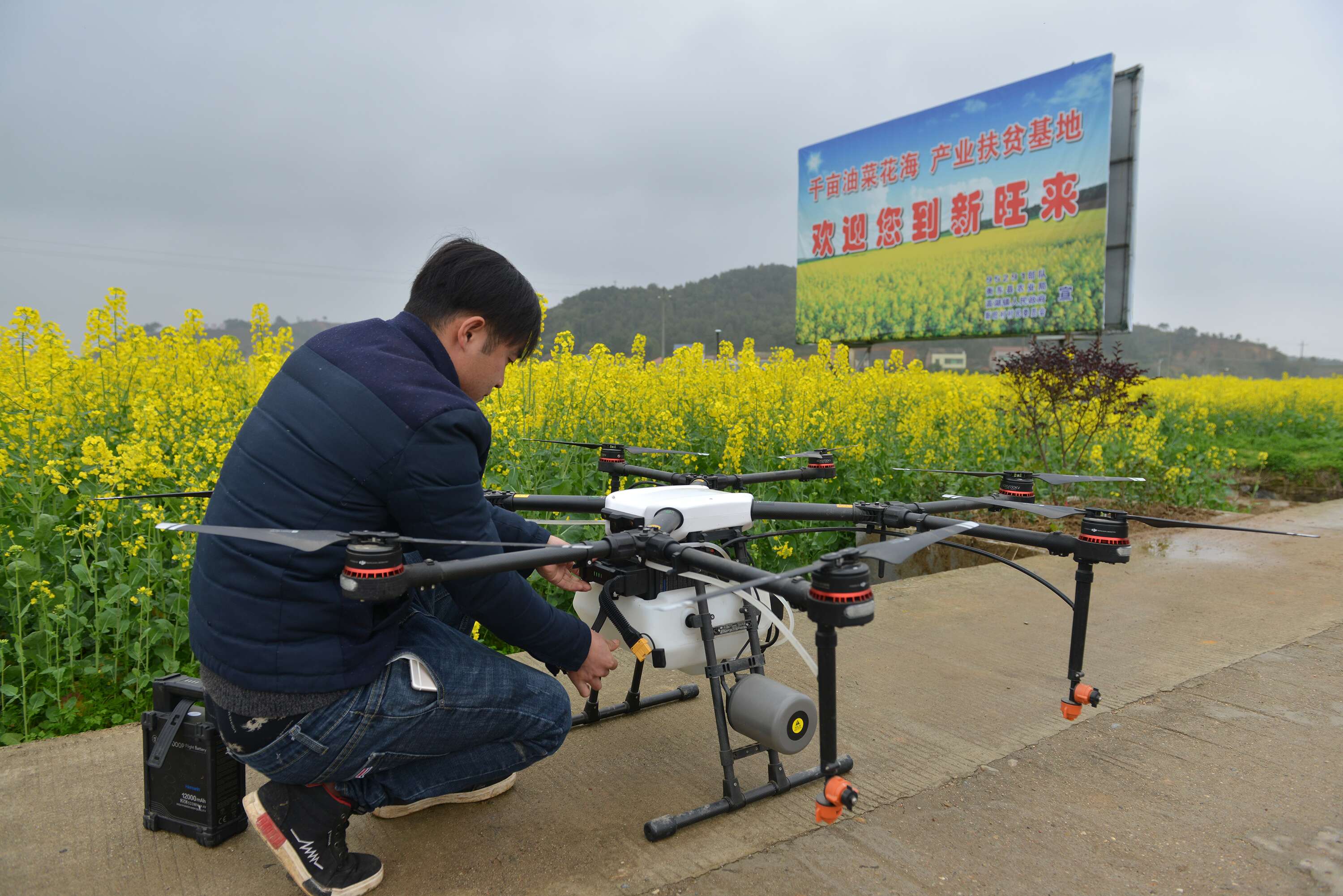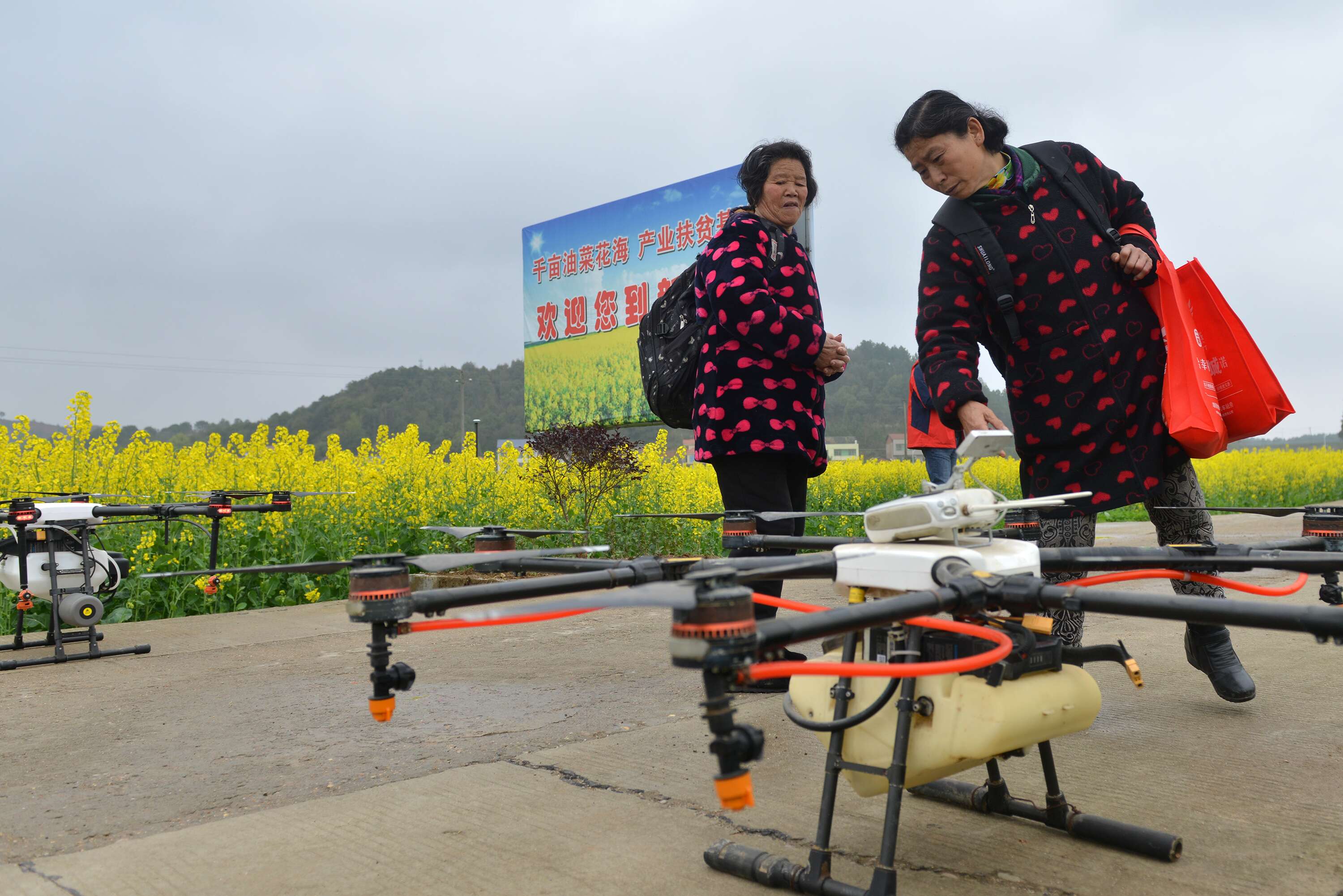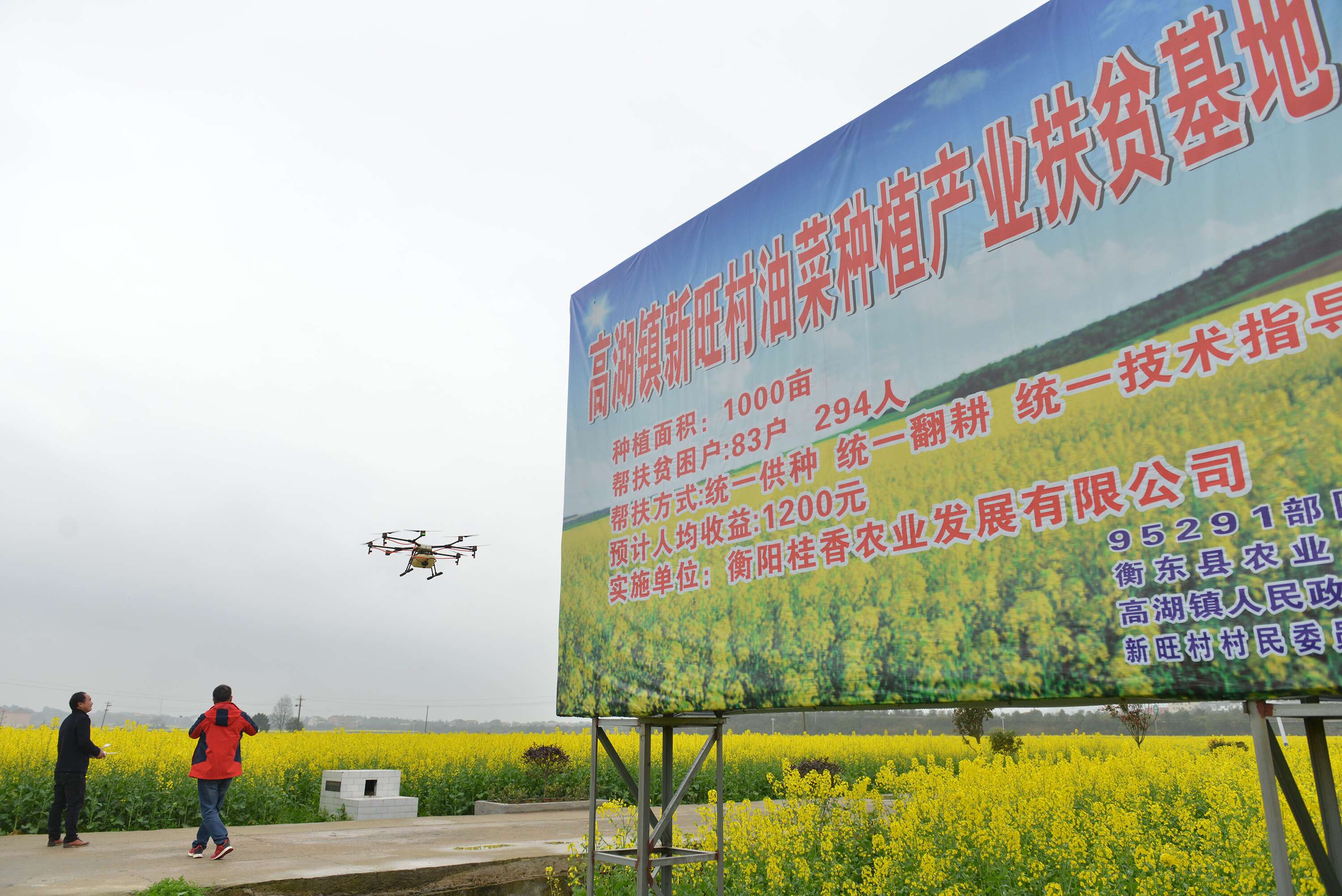 3月18日,衡东县高湖镇新旺村油菜种植产业扶贫基地,有多架无人机在进行飞防作业,帮助贫困户进行病虫害防治。