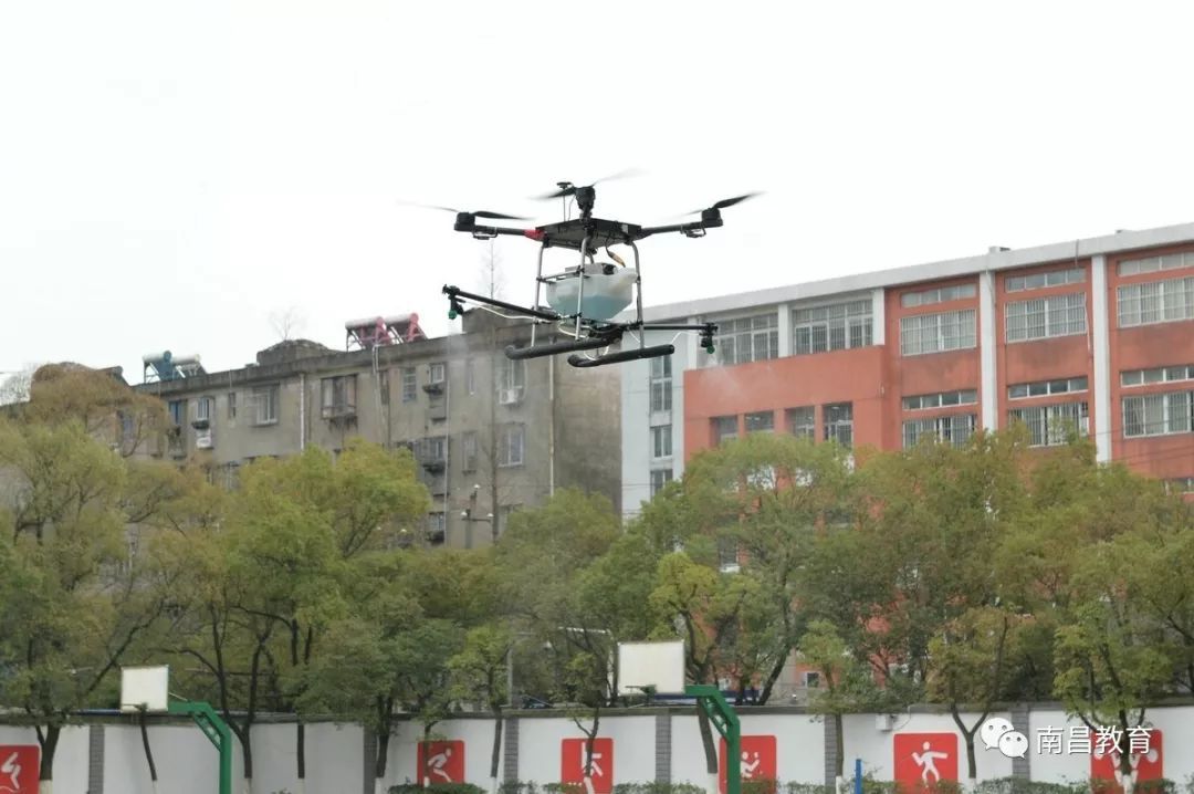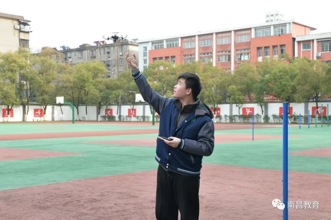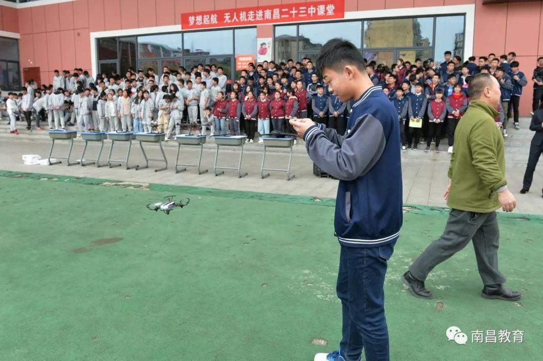 伴随着螺旋桨发出的嗡嗡声,一架无人机在南昌二十三中的操场上升空,随即下放的条幅告示着这次活动的主题:“梦想起航——无人机走进南昌二十三中课堂”。