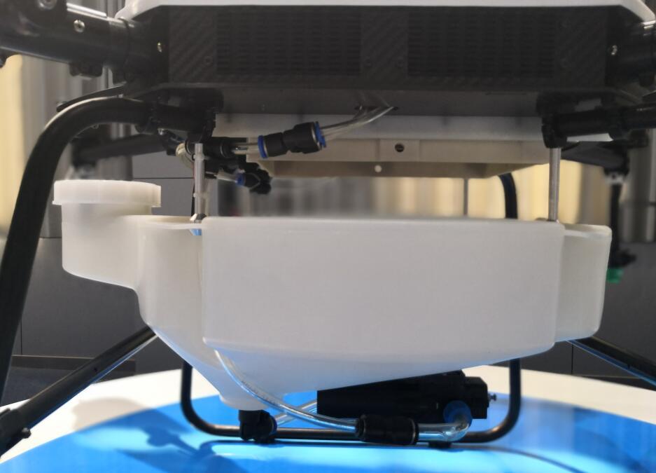 喷施组件是植保无人机与其他用途无人机的本质区别,喷施组件由药箱、水泵、软管、喷头等组成。用于在无人机飞行过程中,将农药从药箱中吸出并通过喷头喷出,再利用螺旋桨旋转产生的向下的风场实现穿透性的喷施效果。