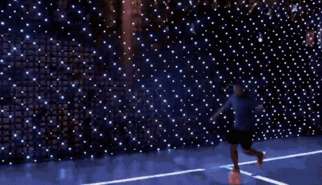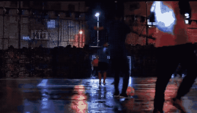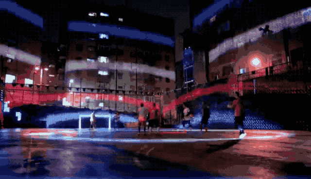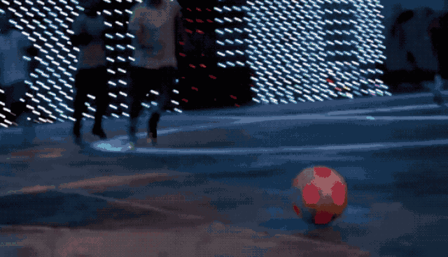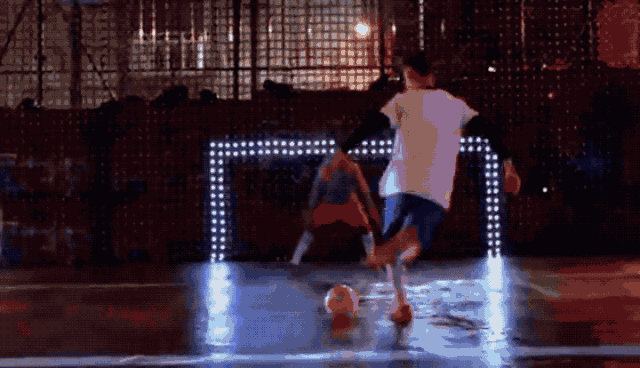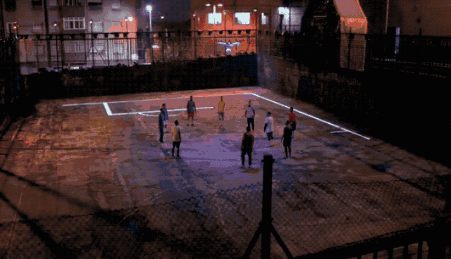 紧接着,原本空荡荡的场地上竟投射出白色光亮的球场边界线和中场线,记分牌和球门也在四周的栅栏上被投射出来。原来这是一场由无人机及投影设备所造就的多媒体“全自动”足球场,当无人机将足球放下的那一刻,比赛正式开始了!