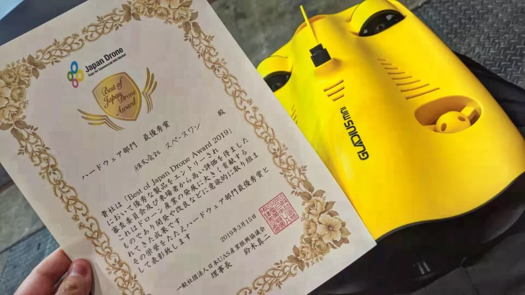 太平洋时间2019年3月15日,Japan Drone 2019(日本最大规模无人机展)毕展日,深圳潜行创新自主研发的新一代潜拍无人机鲛GLADIUS MINI经多轮角逐,荣获本次展会硬件部门最高奖与评审团特别奖,成为最大黑马。