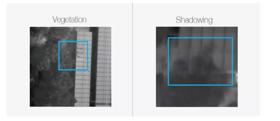 遮蔽物检测(上图):包括植被遮蔽,环境物遮蔽,邻近的太阳能板遮蔽。提前检测及预防可节省植被管理费用。