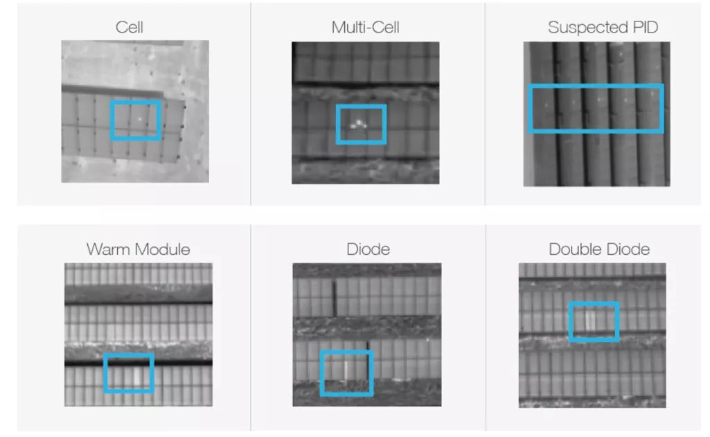 常见的异常,除了以上图示外,还包括:通过检测缺失模组来检测违规建设(需结合电站规划图),气温、冰雹、洪水、台风等破坏,在热能或放射性、红绿蓝影像里出现的分层及其他潜在模组异常。其他诸如组件灰尘检测、组件热斑检测、组件遮挡检测、组件污垢检测、组件裂痕检测、组件不发电检测、组件防反二极管损坏检测,组件背板划伤以及汇流箱发热等设备故障、隐患也能精确地检测出来。