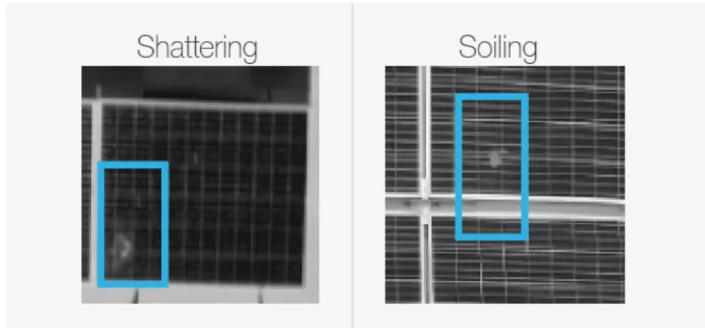 碎片&污物检测(上图):光伏电站周边的碎片物体,如模组安装时产生的碎玻璃,土壤里的污物,飞鸟污物及其他残骸也可以轻易被检测到。