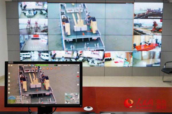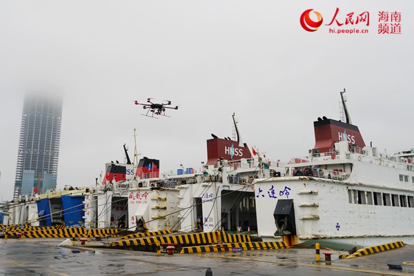 边检民警正在操作无人机对秀英港口开展巡查