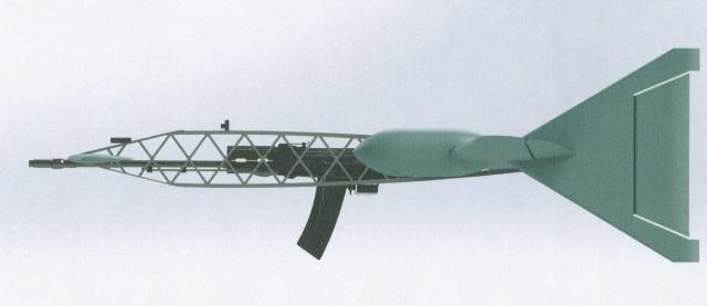 据称,阿尔马兹-安泰公司在其专利书声名了一种独特的无人飞行器构型,该构型的显著特点是:中央机身内置了一把“嵌入式”自动步枪,机身两侧装备有平面状机翼,动力推进装置疑似装在两侧机翼上。