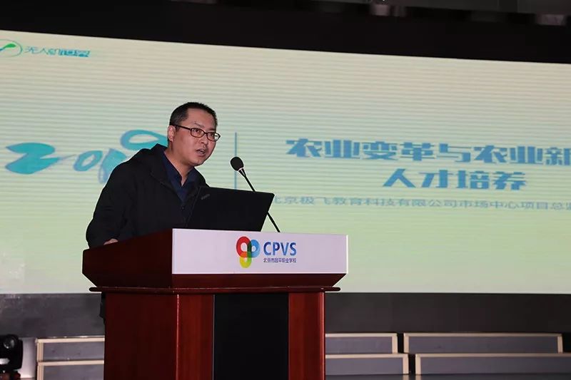 北京极飞教育科技有限公司市场中心项目总监闫斌演讲了《农业变革与农业新型人才培养》,讲述了目前我国智慧农业发展5个痛点问题,以及智慧农业人才需求状况,分享了极飞农服的生态链以及农服金融模式,对此提出了极飞农业教育人才培养方案,建立“无人机行业人才培养+应用实践+创业孵化”的教育模式。