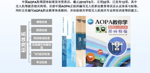 我们经过跟北京航空航天大学研究合作,共同推出了一个无人机系统专业工程师认证体系,科目,教材、大纲以及标准我们已经全部做好,目前正在准备题库,大约5月份左右可以推出,6月份可以开始全国无人机系统专业工程师的考试。
