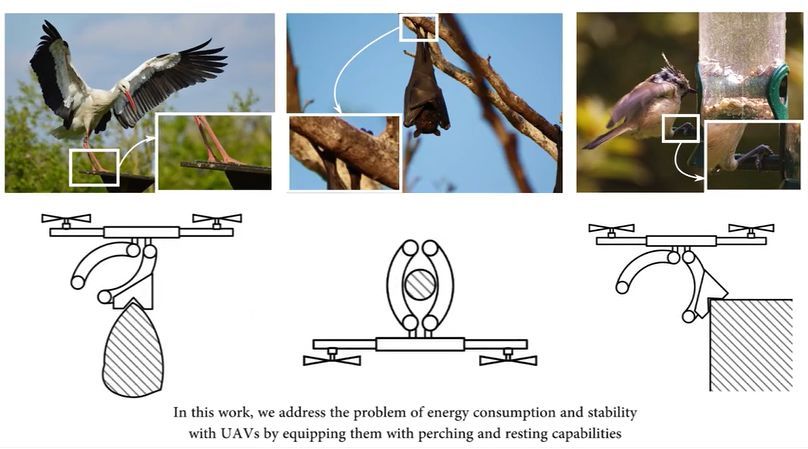 经过大量的工作,他们想出了一种设计,允许无人机降落在平坦或半平坦的表面上,悬挂在诸如树枝之类的物体上,或者对诸如窗台之类的物体执行倾斜式程序。这些起落架看起来很像鹰爪。无人机还可以通过机载的传感器自动寻找和着陆在休息地点。