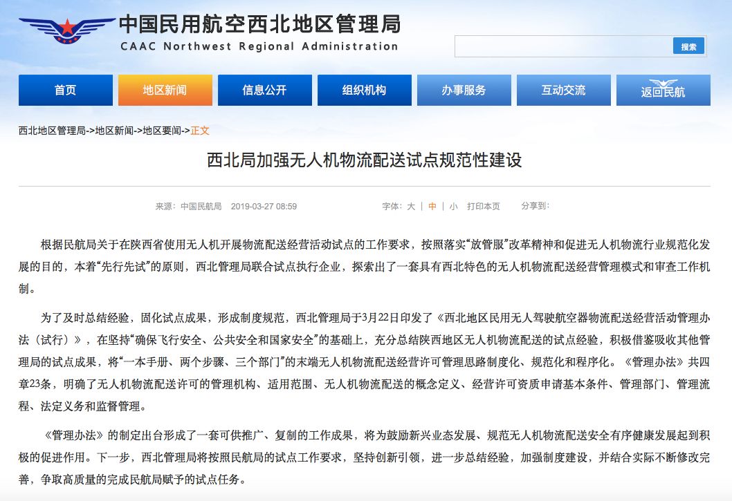 近日,中国无人机商用领域迎来重磅利好:中国民用航空西北地区管理局再次实现无人机管理新突破,正式印发了《西北地区民用无人驾驶航空器物流配送经营活动管理办法(试行)》(民航西北局发[2019]66号)(以下简称“管理办法”)。这意味着起飞重量不大于150千克的物流无人机可“翱翔大西北”。而随着无人机配送场景的不断拓展和大规模应用,以京东物流为代表的企业正在配合民航管理等部门积极探索监管体系的升级完善,成为推动无人机行业商用化的重要力量。