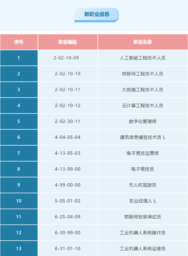 4月1日,人力资源社会保障部、市场监管总局、统计局正式向社会发布了人工智能工程技术人员、物联网工程技术人员、大数据工程技术人员、云计算工程技术人员、数字化管理师、建筑信息模型技术员、电子竞技运营师、电子竞技员、无人机驾驶员、农业经理人、物联网安装调试员、工业机器人系统操作员、工业机器人系统运维员等13个新职业信息。