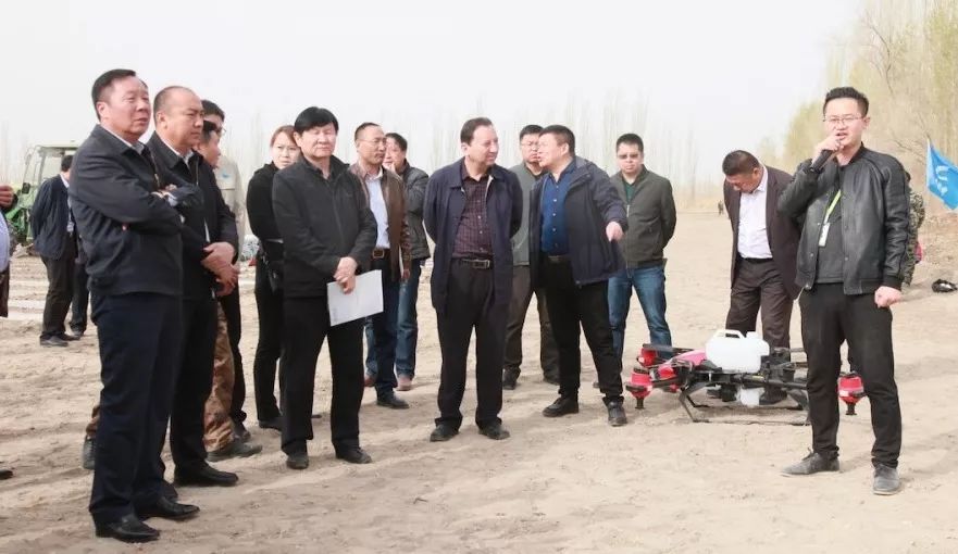 自治区党委农办副主任、厅党组成员、副厅长徐涛、尉犁县委常委、统战部部长帕尔哈提·吾买尔、尉犁县委副书记、县长艾尔肯·莫合木提、尉犁县农业农村局局长张晓冬等领导莅临现场,极飞工作人员为各位领导介绍了 P 系列植保无人机全自主作业及精准喷洒的特点。