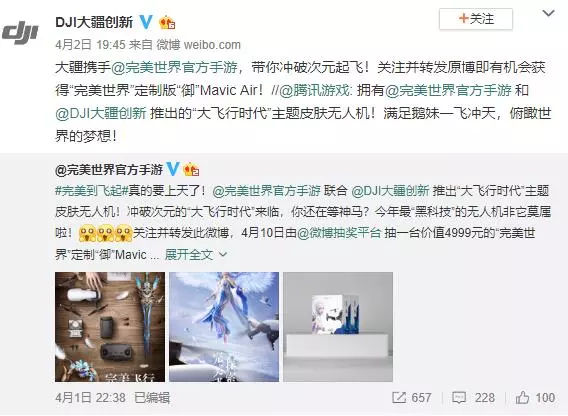 日前,由完美世界研发,腾讯游戏发行的自由飞行战斗手游《完美世界》宣布与国内领军的无人机企业 DJI 大疆创新达成合作,以全面开启「大飞行时代」为主题推出一款全球限量联名定制科技礼盒。《完美世界》手游率先在微博发声,壕送一台「完美世界手游」定制皮肤「御」Mavic Air 无人机,微博活动内容得到@腾讯游戏、@DJI大疆创新等大 V 转发热评,更是引发了广大玩家的热情参与,微博转发评论数持续上涨。