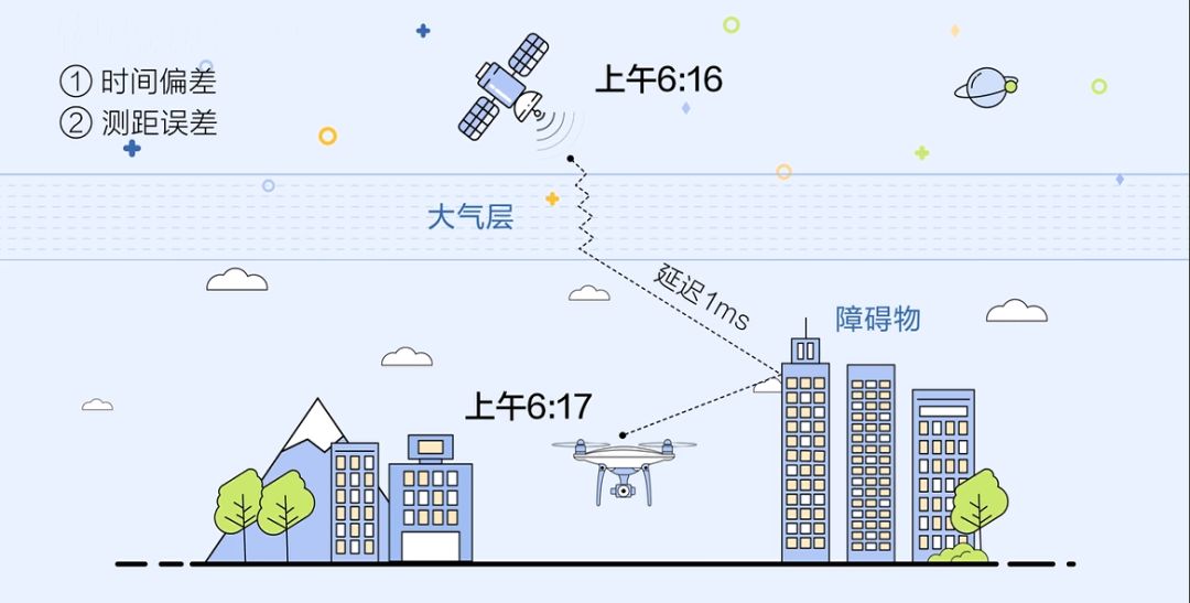 例如:卫星星载时钟和接收机上的时钟并不能始终保持同步,这就会造成时间上的偏差信号;如果在传播过程中受到大气层和各种障碍物的反射,信号传播路径就可能变长,造成测距误差等。