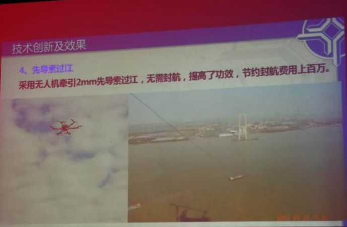 中交二公局的工程师介绍,项目使用无人机假设先导索节省了上百万元。据了解,该项目有大沙水道和坭洲水道两座超千米级的悬索桥,工程师巧妙的先用无人机将2mm的先导索送到对岸,然后用其拉动较粗的绳索,再用此线拉动更粗的绳索。 据中交二公局的工程师介绍在使用无人机之前有四种方式,但都各有各的问题。第一种是用船舶拉过钢索,这种方式需要中断此处的航运,除了手续繁琐外还会造成至少上百万元的经济损失;第二种方式是用火箭弹投送先导锁,但对岸的目标区域很狭小,非制导火箭很难成功、精确制导的导弹成本又惊人;第三种是用有人驾驶直升机,但这样非常昂贵而且带着长钢索飞行也很危险;第四种则是用飞艇,但飞艇的操控性、抗风性也都不好,在实际使用中困难重重。