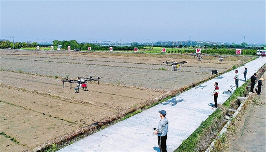 朱海伟和伙伴们操作农用无人机作业。