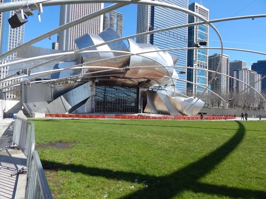 芝加哥千禧公园,大型的城市公园,后现代化风格的建筑,是芝加哥标志性景点。公园的一侧是芝加哥繁华的密歇根大街,另一侧则是风景秀丽的密歇根湖。“银豆”云门、“浪花”露天音乐厅和“人脸”皇冠喷泉是千禧公园最具代表性的三大后现代建筑。云门由168块不锈钢板焊接而成,但表面却很平滑,看不出丝毫的接缝。光滑的云门表面反射着天空、城市的高楼大厦,形成独特扭曲的画面,令人惊叹不已!