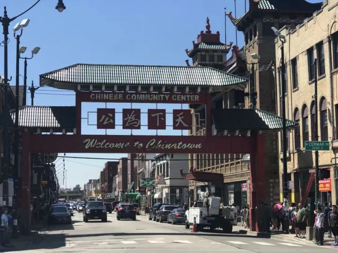 芝加哥中国城位于芝加哥北面的盔甲广场社区,以舍麦路和永活街为中心,是美国第二古老的华人社区。在永活街社区的北边有一个很大的中国城广场——美国中西部的大型中国市场。入口处建有一座中国式大牌楼,雕梁画栋,色彩鲜艳,正面刻有孙中山手书的“天下为公”,背面刻有“礼义廉耻”,是芝加哥唐人街的标志。