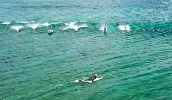 当一群冲浪者在冲浪板上划水时,他们惊喜地发现一群海豚径直向他们游去。这些海豚游到他们的下方,排列整齐,在冲浪者的注视中和他们一起前进,随着波涛持续冲浪。澳大利亚海豚游泳学校的冲浪者肖恩彼得森还用一架载有4K相机的无人机捕捉到了这一令人惊叹的时刻。