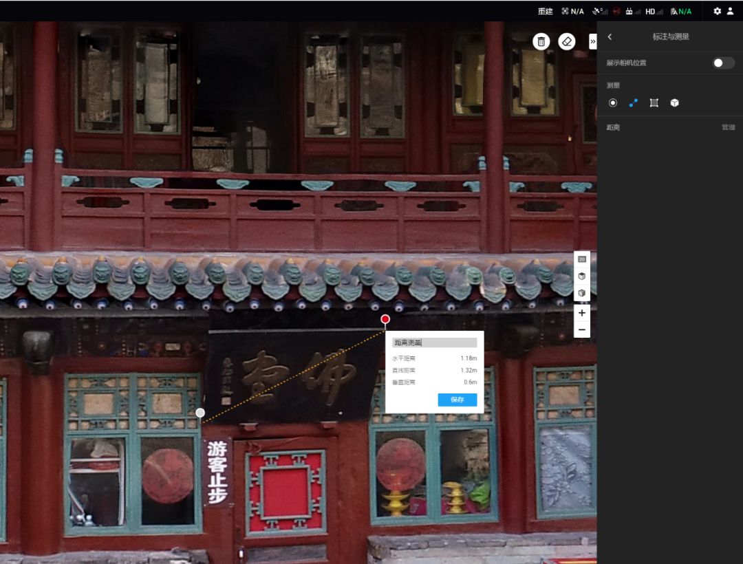 工作人员在三维模型上点击目标部位,可以轻松测量出对应的坐标、距离、面积和体积,将原本只能由人工定性描述的问题数据化。在模型上发现受破坏或腐蚀的部位,还可进行标注并导出,为针对性的修复提供依据。