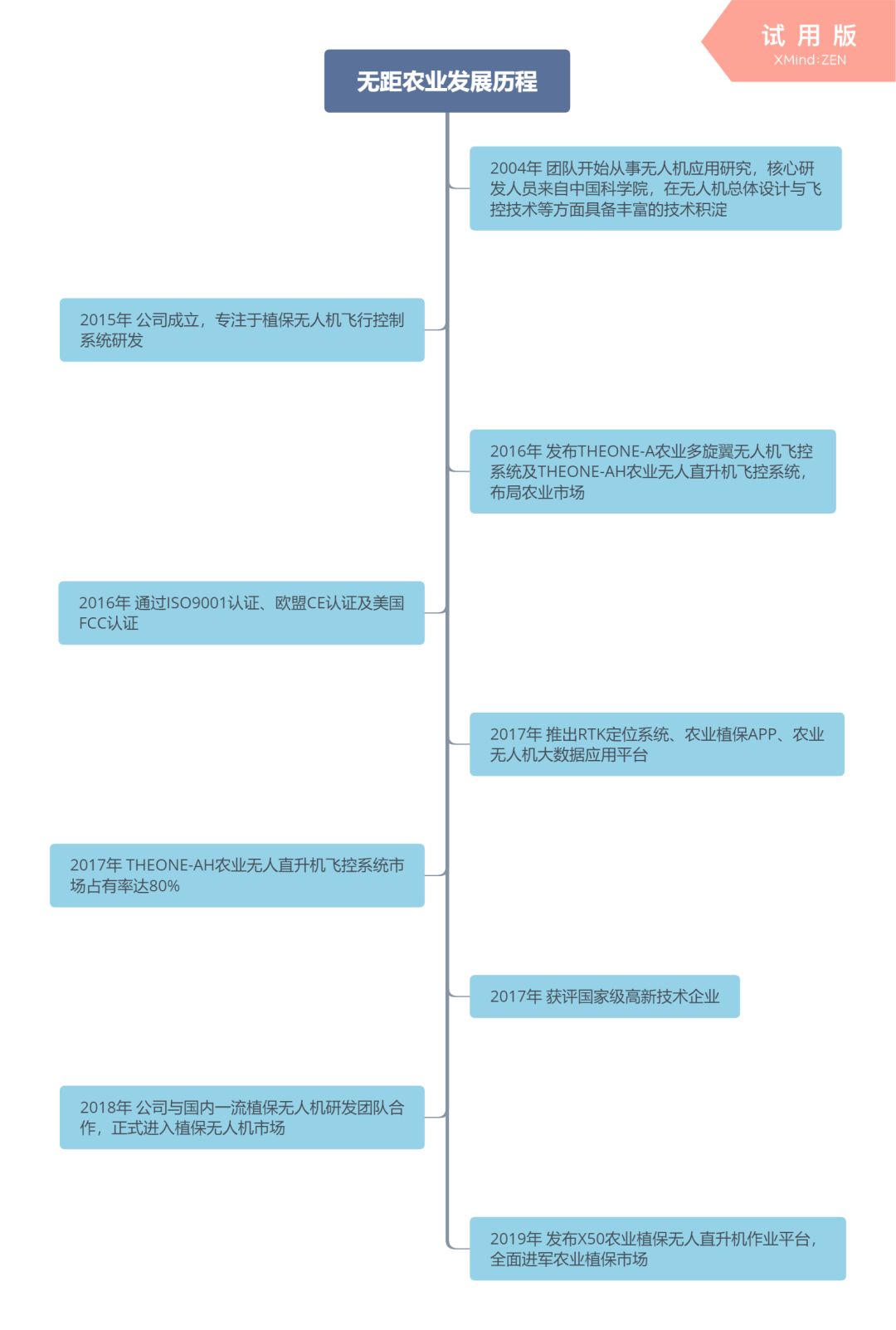 无距农业作为一家集无人机研发、生产、销售、培训于一体的综合性高科技企业,致力于为客户提供高效的植保无人机解决方案,其核心研发团队来自中国科学院及国内外知名院校,且大部分成员曾就职于高科技企业或科研院所,从事植保无人机设计、研发、生产及售后10余年,在总体、气动、飞控、结构等领域拥有80项核心专利。先后成功研发出农业多旋翼无人机飞控系统、农业无人直升机飞控系统、RTK定位系统、植保大数据平台、农业植保无人直升机等多款产品。在植保无人直升机飞控市场占有率近90%,植保管家大数据平台在线服务超过1000架植保无人机,2018年大数据平台累计服务达30000小时。公司凭借严格的生产管理制度、先进的生产技术、优质的产品质量,已通过美国FCC认证、欧盟CE认证及ISO9001认证。