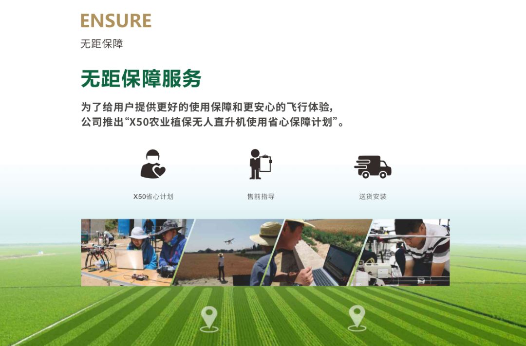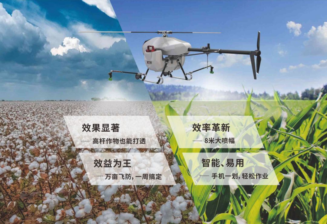 无距农业通过技术革新、突破行业瓶颈,本着优质、高效、简单的设计理念,X50农业植保无人直升机作为一款“大风场、强效果、高效益、大载荷”的植保工具,凝结了公司多年积累的技术储备、市场反馈、实际作业经验,以轻便、可靠为核心,大幅降低产品成本,提高产品市场竞争力;通过全自动飞行等功能降低操控难度,创造直升机操作人员培训4天的行业极限。为市场提供作业效率更高、效果更优、效益更显著的无人直升机产品及服务,致力打造成为植保无人直升机的标杆。