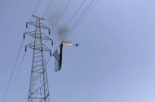 4月9日,在内江经开区110千伏寿马线#6大号侧下导线处,一架盘旋在空中的多旋翼无人机喷出一道耀眼的火焰,瞬间点燃了挂在输电导线上的塑料薄膜异物,塑料薄膜迅速燃烧殆尽。
