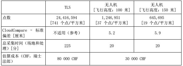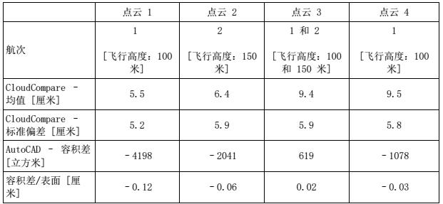 表 3:Trimble SX10 采集所得点云(我们的参考点云)与 eBee Plus UAV 采集所得的四个不同点云对比结果列表。