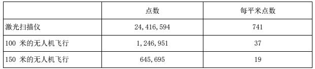 将 100 米与 150 米高无人机飞行合并所得点云包含的点数与 100 米飞行点云的点数相似。这是因为合并处理的两次飞行的图像使用的是与 100 米飞行完全相同的图像处理设置。