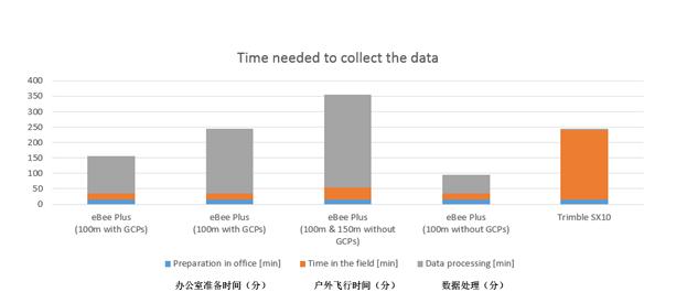 就每种技术(图片 1)所需的总数据生成时间(采集和处理)而言,在开启 RTK 模式且未使用 GCP 的飞行情况下,这一时间是 TLS 相应时间的三分之一。在单次飞行高度为 100 米、使用 GCP 的无人机飞行情况下,这一时间可节省大约 40%。