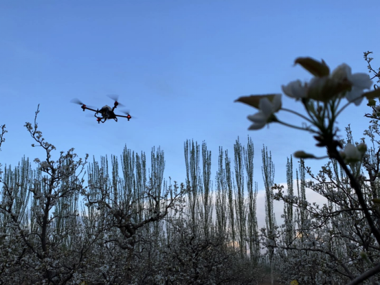 库尔楚梨农高山请来的极飞植保作业队。他们采用库尔勒香梨研究中心专门配置的营养母液(含硼、钙等元素),有效地延长花期,更大地增加香梨的授粉几率。