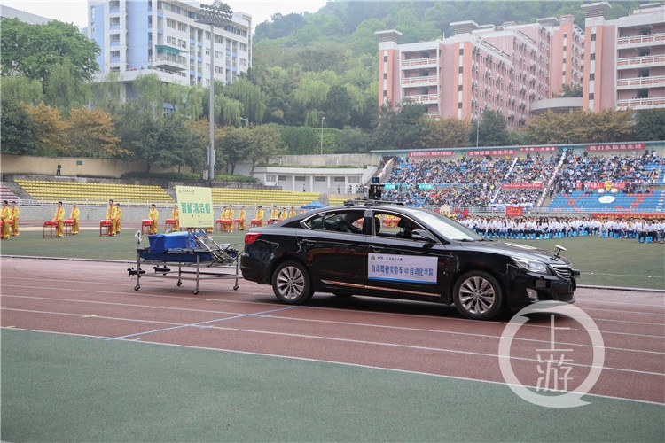 在开幕式上,最让人感到振奋的是,由重庆邮电大学自主研发的第二代无人驾驶汽车。当它缓慢行驶在跑道上,全场师生一片欢呼和掌声。
