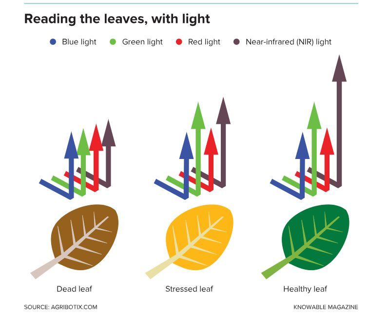 美国宇航局早期通过卫星监测大平原植被生长的努力推动了NDVI的发展。植物的叶子可以吸收和反射不同波长的光:健康叶子中的叶绿素吸收可见光,同时反射近红外光。黄色、受压的叶子和死叶(以及作为土壤的岩石)以不同的方式反射和吸收这些波长。配备传感器的无人机可以收集这些光谱数据,并创建显示作物健康变化的地图。