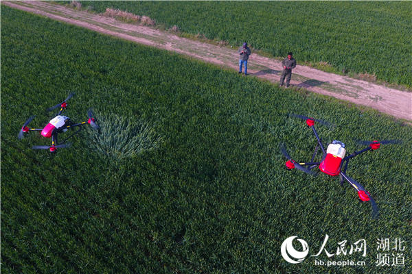 4月12日,湖北省襄阳市,农业植保人员在襄州区古驿镇新庄村麦田操作植保无人机进行农药喷洒作业。