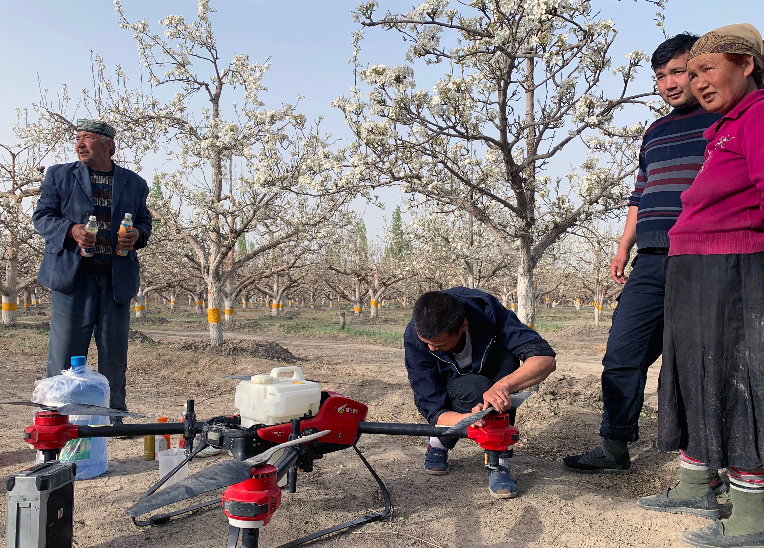 库尔楚梨农高山请来的极飞植保作业队。他们采用库尔勒香梨研究中心专门配置的营养母液(含硼、钙等元素),有效地延长花期,更大地增加香梨的授粉几率。