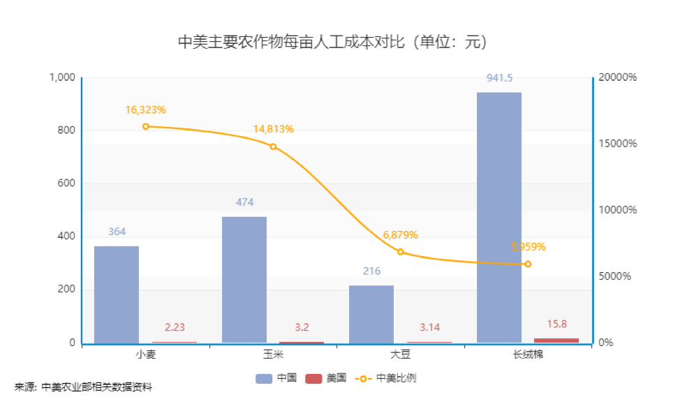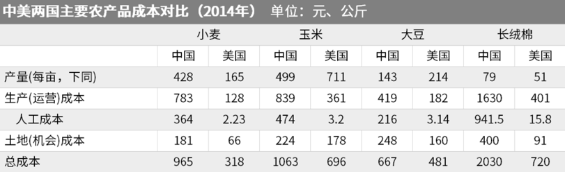 2016年,国家发改委曾发布了几张中美农产品的数据对比表格。根据数据,我们经过简单计算就能得到中美主要农作物单位生产成本、以及每亩人工成本的对比。
