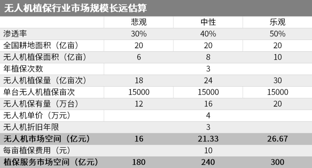 我们可以得到乐观、中性、悲观状态下对应的无人机保有量分别为20万、16万、12万台,远期中国无人机植保服务市场空间大概在180亿~300亿元,而无人机本身的销售市场空间大致在16亿~26亿元之间。